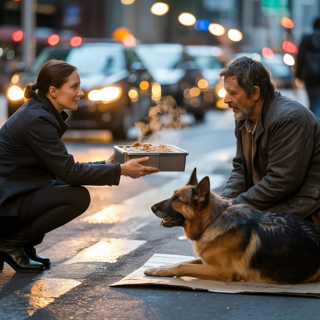 “I’m sorry,” he said, his voice rough, low. “I’m not asking for money, just food. I haven’t eaten in days. Can you spare anything for me and my dog?”